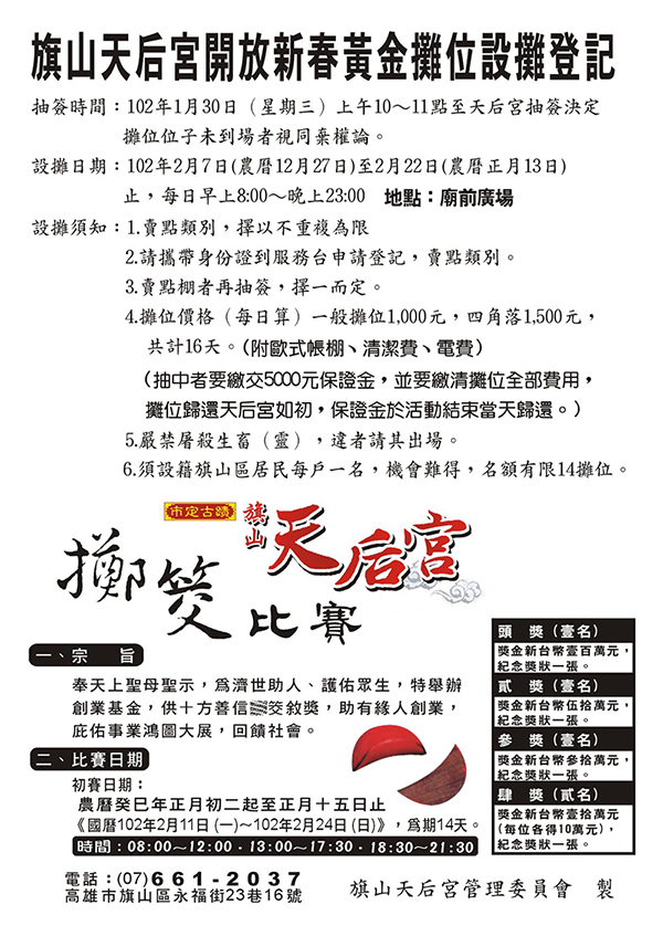 旗山天后宮 歲次癸巳 中華民國102年點燈 開始受理登記今年犯太歲正沖生肖-蛇 偏沖生肖-豬光明燈 緣金500元太歲燈 緣金500元文昌燈 緣金500元平安斗 緣金3600元財運斗 緣金5500元